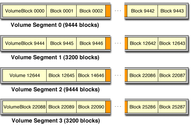 The following figure shows a volume with four volume segments (25288 volume blocks):