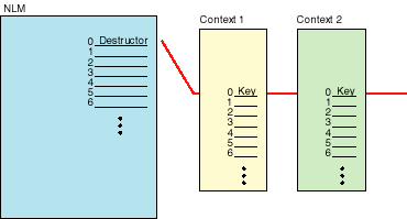 Key-value pairs can be thought of as data arrays that are maintained in each context, and a key is an index into this data array. The act of allocating a key reserves the same slot number for all contexts in the current NLM application and returns a slot number into the data array that is maintained by the specific context. The following figure illustrates this process for a key that has been created for slot 0 in the array.