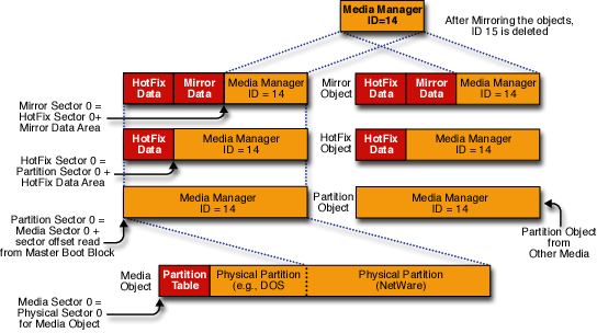The parent object in the Media Manager’s object hierarchy is the adapter object. For every non-removable device (that is, a device that can contain only one piece of media, such as a hard disk) the Media Manager automatically creates a media object. The figure below shows an example of how, by starting from the two media objects (one of which is not shown), the Partition API set is used to build a single mirror object. The file system will then perform I/O to the mirror object. Following is a sample sequence of events that properly use the Partition APIs.