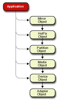 Many of the IO object types work together to define the IO data path. IO requests can start anywhere within the path and then always proceed downward and an IO request never completes higher in the path than its origin. For example, in the following figure, if an IO request originated at the partition object, it would proceed downward to the media object and would complete through the partition object and not the Hot Fix or mirror object.