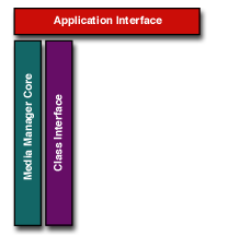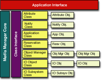 The Media Manager foundation is the component upon which all other I/O services are built. It is comprised of the core, the application interface, and the class interface, as illustrated the following figure.