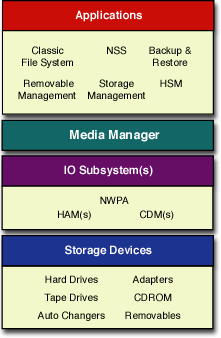 The following figure illustrates four distinct sections of the NetWare Storage I/O System environment built to be supported by the Media Manager.