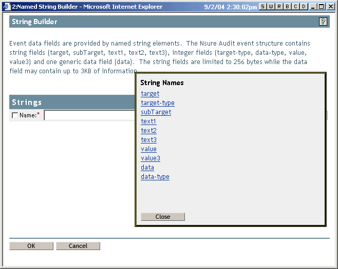 - Generate event. Nsure Audit has been changed to allow for more event data to be passed. Event data fields are provided by named string elements. The Nsure Audit event structure contains string fields (target, subTarget, text1, text2, text3), integer fields (target-type, data-type, value, value3) and one generic data field (data).