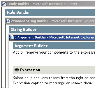- The browser windows displayed for the Rule Builder, Argument Builder, and String Builder are numbered and are modal. For example, if you are in Rule Builder and open the String Builder and Argument Builder, the windows are numbered 1:Rule Builder, 2:String Builder, and 3:Argument Builder, as shown in the following figure.