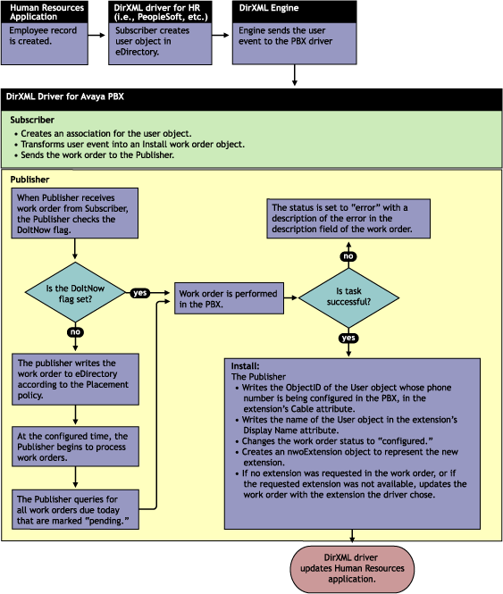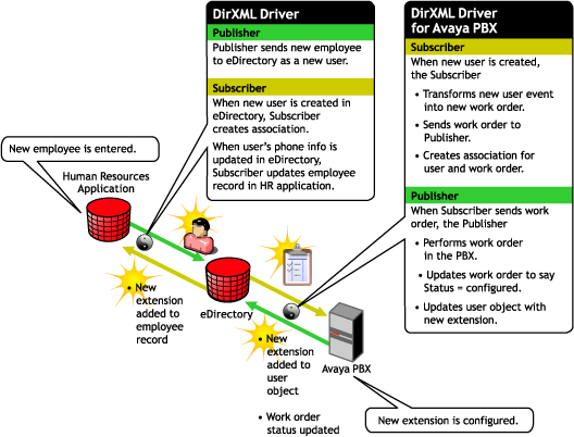 Through the Publisher Channel, the Identity Manager Driver for Avaya PBX queries the PBX for information about extensions, places work order objects in the correct container, performs work orders, and sends updates to user objects.