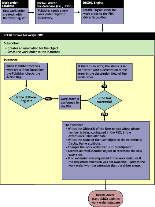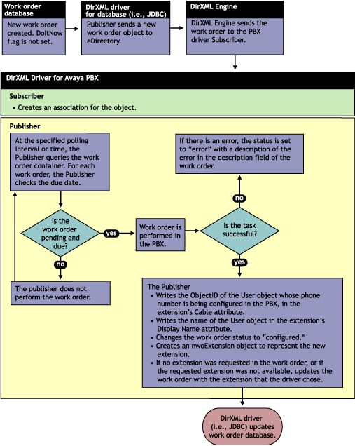 Work orders are entered in the work order database, and are mirrored in eDirectory as nwoWorkOrder objects because the JDBC driver sends them to eDirectory. The Identity Manager Driver for Avaya PBX performs the work orders and the results are returned to eDirectory. The JDBC driver then updates the work order database with the results. This allows the person who entered the work order to check on the status in the work order database.