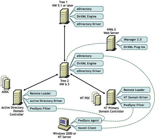 DirXML engine and DirXML driver for eDirectory: Because data in two Novell® eDirectoryTM trees is being synchronized in this scenario, the engine and the eDirectory driver are installed on two separate NetWare® servers in two separate trees. The engine always needs to be on a server holding a replica of the data you will be synchronizing.