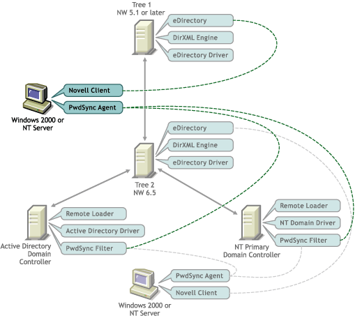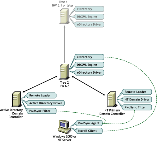Without this PasswordSync setup, password changes made in Tree 1 would be synchronized to Tree 2, but would not be synchronized with Active Directory or NT.