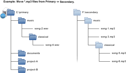 For example, a policy run for a standard pair might move all files with extensions of .mp3 from the primary location to the secondary location.