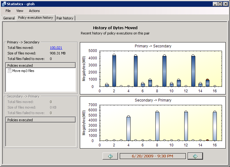 The tab in a pair’s Statistics dialog box provides information about the most-recent 16 runs of policies on the pair. You can examine which policies were run and when. For each policy run, you can view lists of which files were moved and which files should have moved but did not move. This helps you to understand if policies are moving the files you expect to be moved.
