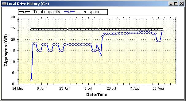 The following sample Local Drive History graph displays the capacity history for a disk that is managed by Dynamic File Services, where the disk contains one or more primary paths of pairs. Policies were scheduled to run during non-peak hours so that the data could be moved over a period of days or weeks, depending on the amount of data to be moved, while allowing users to continue working with the data.