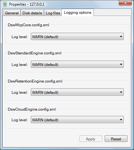 In the Server Properties dialog box, select the tab to view the logging level settings for the Service and Standard Policy logs on the server.