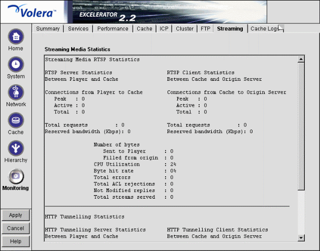 Connections from Player to Cache: These statistics are for the RTSP/RTP connections from clients (players) to the appliance. If QuickTime HTTP Tunnel Caching is enabled on the Streaming Tab, HTTP tunneled statistics are included.