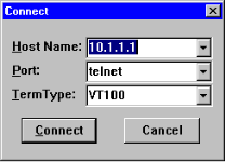 Enter the appliance IP address in the Host Name field > select Telnet for the port and VT100 for the terminal.