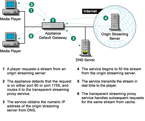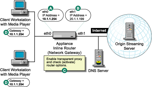 With a transparent/inline router setup, an appliance's eth0 IP address is specified as the default gateway for the client workstations that the players reside on. The eth1 port connects to the Internet. The appliance provides routing and caching services and serves as the gateway to the Internet.