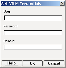 If you will be going to a site that requires NTLM authentication, check the Requires NTLM Authentication checkbox. Then click the Set button. A new dialog will appear: