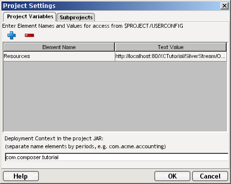 You can think of Project Variables as being global variables with project scope. They are stored in their own XML document, which gets deployed with other project resources at deploy time. This tab allows you to specify the names and initial values of any global variables you want to use, with intra-project scope. (These variables will apply in the deployed project as well as at design time.) The variables are actually stored in an XML document at an XPath of $PROJECT/USERCONFIG.