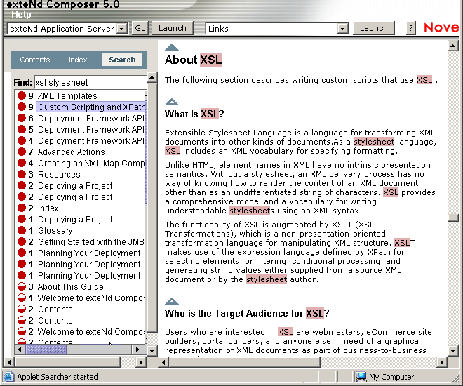 Novell exteNd Composer is a powerful design environment for creating, testing, debugging, and packaging J2EE-based integration applications. It can run in standalone mode or as a subprocess of exteNd Director. The features and techniques described below are applicable in both running modes.