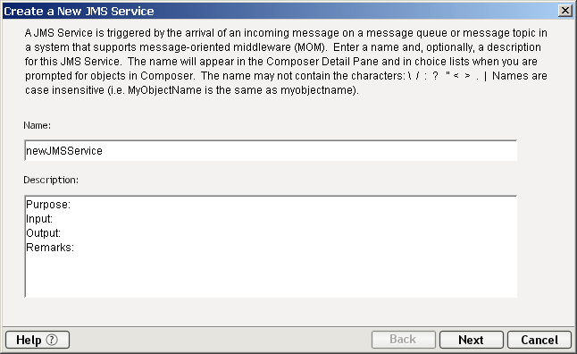 I n the first panel of the "Create a New JMS Service Component" wizard, type the Name you want the service to have and (optionally) Description information.