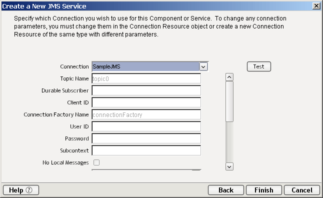 The JMS Service is created much like any other service. Before creating a JMS Service, however, you should already have created a JMS Connection resource for the queue or topic from which your service will be receiving messages. (See "Creating a JMS Connection Resource" for more information.) If you omit this step, you will see an error message similar to the one below: