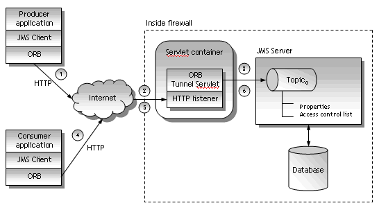 First, a producer application sends a message. Since the producer is configured for HTTP tunneling, the request goes as an HTTP POST to the ORB HTTP tunnel servlet.