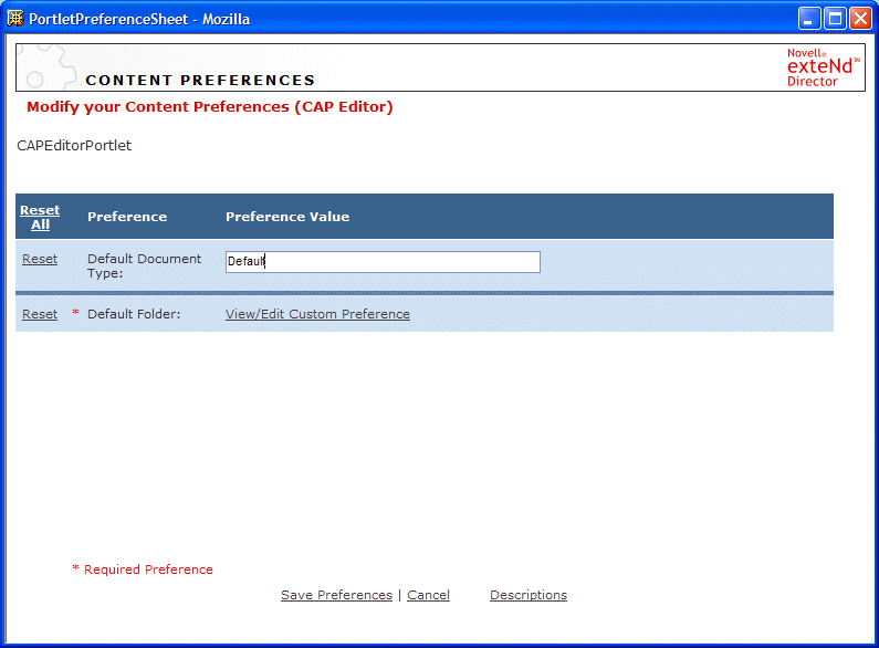 The preference sheet for the CAP Editor portlet looks like this:
