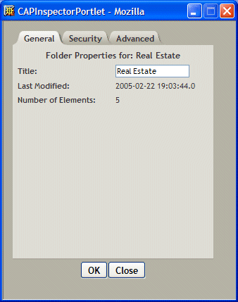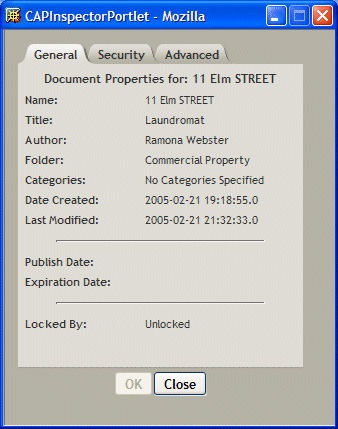 The CAP Inspector portlet provides access to the properties of content elements. The Content Administration portlet invokes the CAP Inspector to allow users to view and modify the properties of folders, documents, and categories. The CAP Inspector is not designed to run standalone.