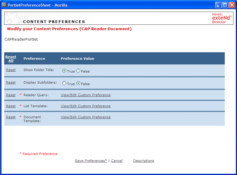 The Reader Query preference allows you to select which folder or document to display in the CAP Reader portlet.