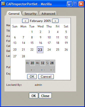 The Calendar widget implements a graphical date selector into a portlet. It is used by the Content Administration and CAP Editor portlets for entering document publication dates and expiration dates.