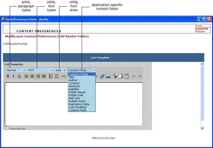Both the List Template and Document Template preferences use the HTML Editor widget for specifying how content should appear in the CAP Reader portlet: