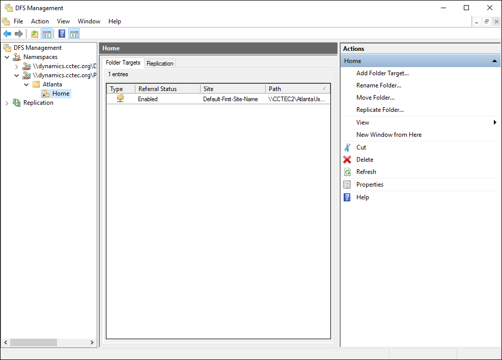 If a DFS namespace is used for high availability, such as ensuring that users can access a replicated copy of their data, it might be appropriate to create multiple targets in a DFS link and disable all but one. If the enabled link target becomes unavailable, an administrator can disable the downed target and enable a replication target. As long as only one target is enabled for a given DFS link, File Dynamics can successfully provision and manage storage through the DFS path.