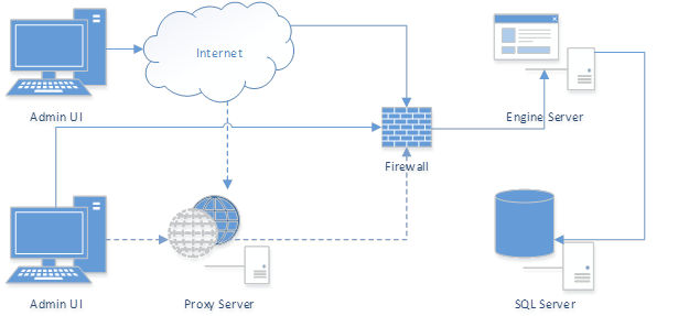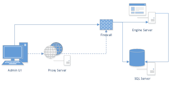 In a legacy configuration, the Admin Client would communicate with the Engine server host directly over a WAN, over the internet, and perhaps through a proxy. In all cases, communication would ultimately go through a firewall to the Engine server host.