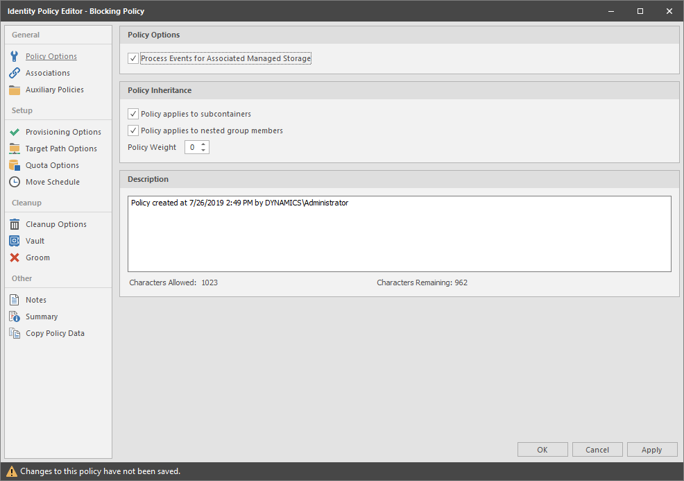 File Dynamics provides the ability to create “Blocking policies” that block other File Dynamics policies from affecting members of organizational units, members of groups, or even individual users. For example, you might have proxy users such as a BACKUP PROXY or VIRUS SCAN PROXY who do not need a home folder. Or, you might have an organizational unit within an organizational unit whose members you do not want to be assigned home folders.