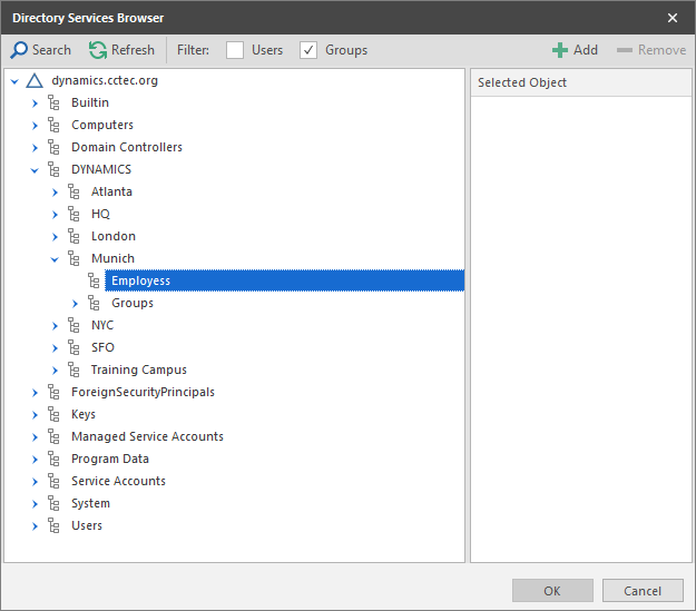 The Directory Services Browser is closed and the object is displayed in fully qualified name format in the right pane of the window. For example, CN=Tellers,OU=HR Department,OU=Henderson,DC=chronicle,DC=local.