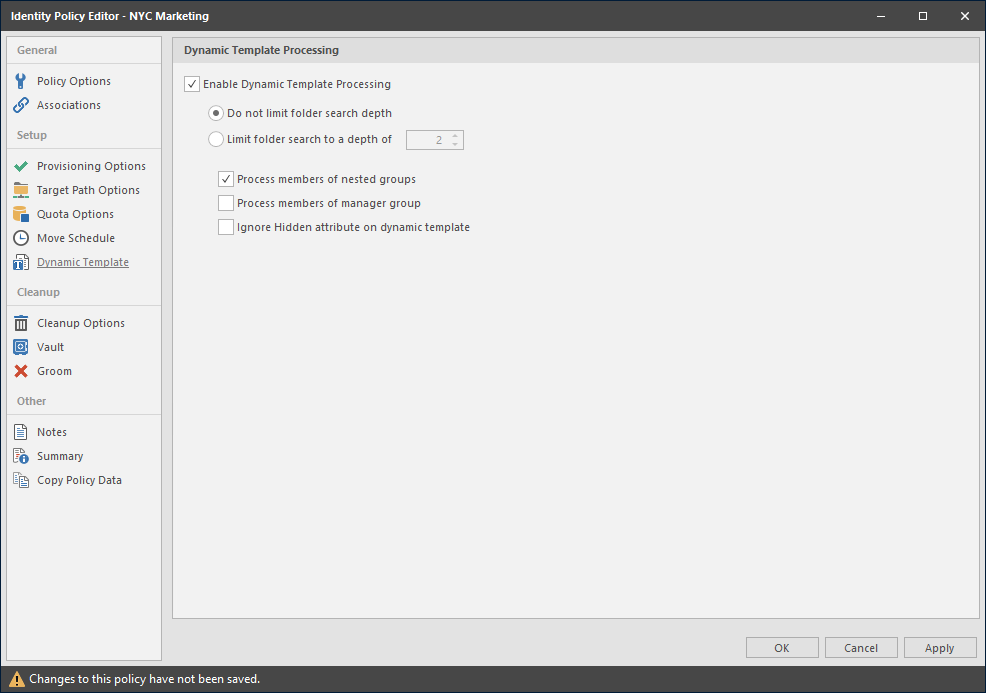 If your collaborative storage template does not include a -MEMBER- folder, File Dynamics will not create personal folders within the collaborative storage folder. Deselect the Enable Dynamic Template Processing check box and proceed with Section 8.7.8, Setting Group Collaborative Storage Policy Cleanup Options.