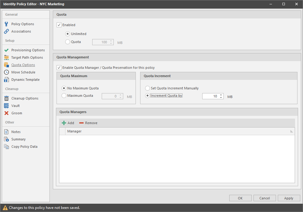 Enable Quota Manager / Quota Preservation for this Policy: Select this check box to enable the Quota Management region of the page.