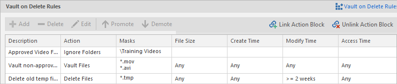 (Conditional) If you have set any rules designed to ignore a vault or delete action, in the Vault on Delete region of the Vault page, use the Promote arrow to move the rule to the top. This protects files or folders specified in the Masks field from being vaulted or deleted.