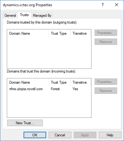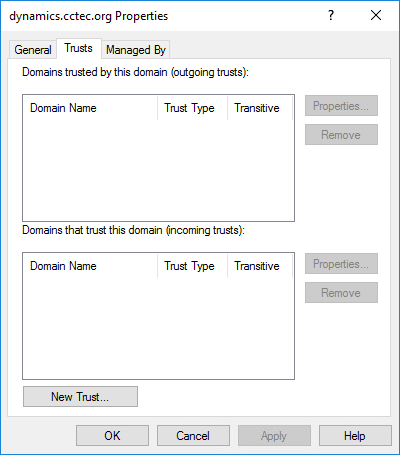 In the Properties dialog box, examine the properties of the trust by selecting the trust and clicking Properties.