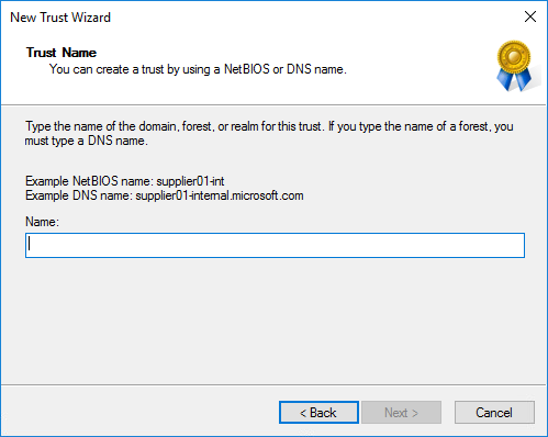 In the New Trust Wizard dialog box, enter the DNS name for the incoming forest trust and click Next.