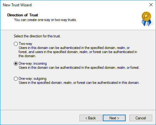 Unless you need a two-way trust, select One-way: incoming and click Next.