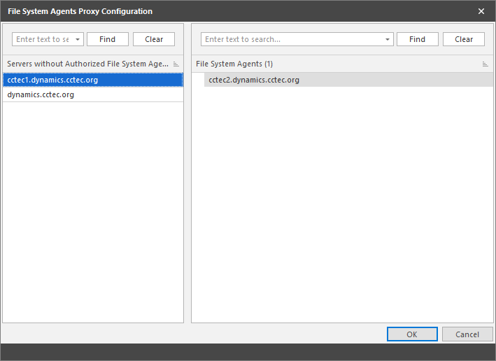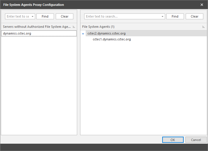 The left pane displays all servers without an authorized Agent. The right displays servers hosting Agents, and consequently, can serve as Proxy Agents.