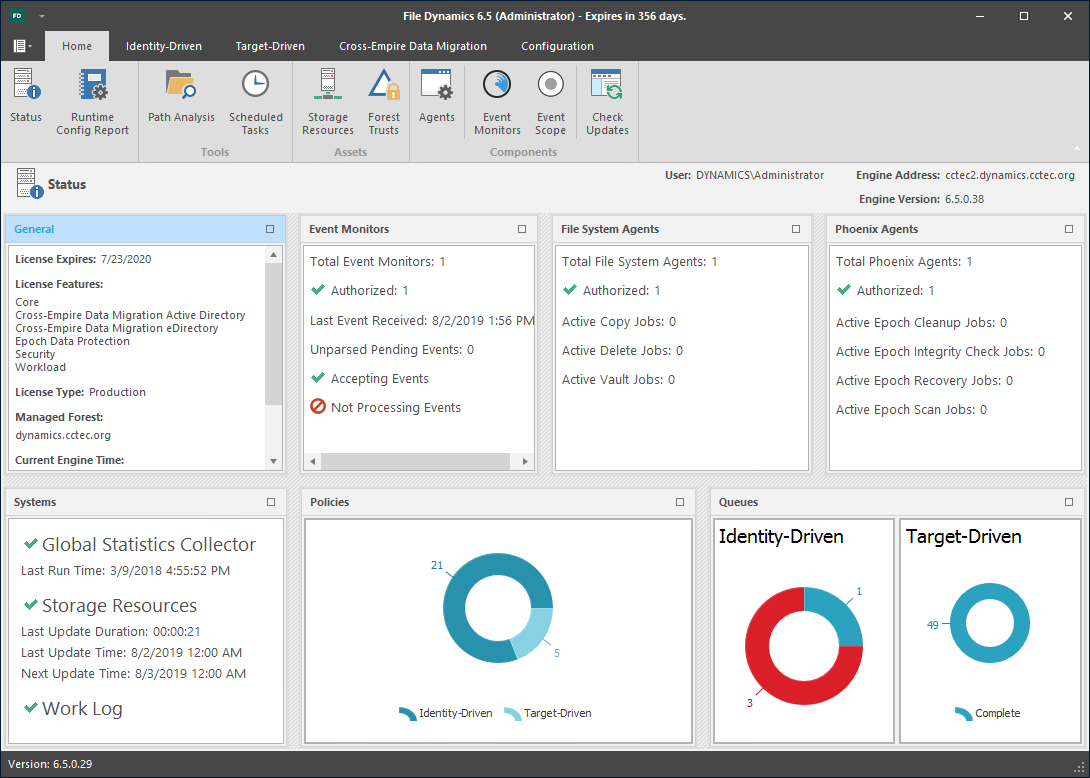 The Home tab provides a dashboard of File Dynamics component summaries, statistics, access to Engine services settings, and more.