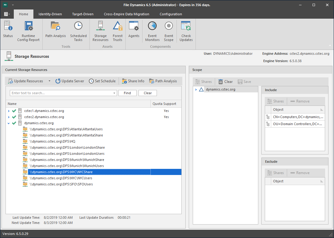 To prevent burdening the File Dynamics Engine in listing or rebuilding all storage devices and shares in the Active Directory forest or domain, you can “scope” the containers of the forest or domain for storage devices and shares to be included or excluded as managed storage resources.