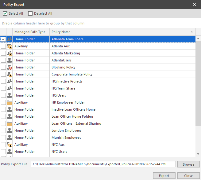 File Dynamics provides the ability to export policies so that they can be imported later. For example, many customers first evaluate File Dynamics in a lab environment and create a large number of policies in the process. You can export these policies and later import them into the production environment. All exported policies are saved in a single XML file.