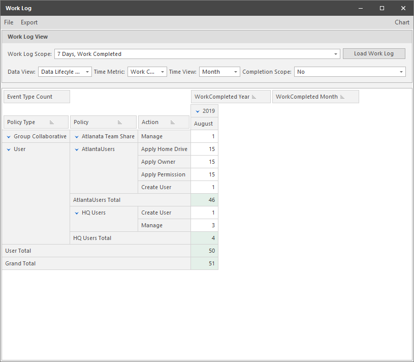 Data Lifecycle Monthly: This Work Log report option specifies events by policy type, policy name, action, and month according to the selected Time Metric, Time View, and Completion Scope options.