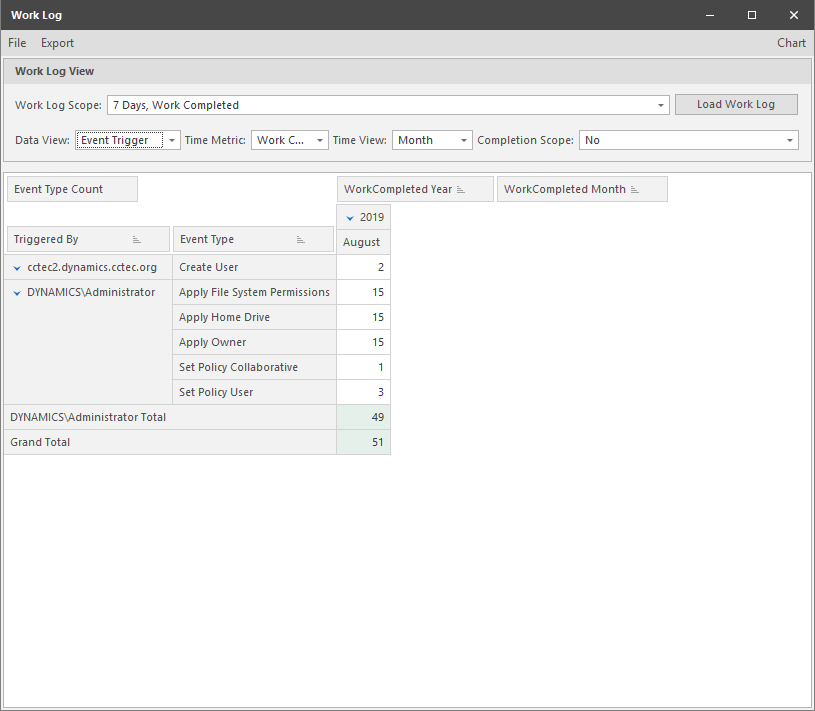 Event Trigger: This Work Log report option specifies events generated by an Event Monitor or a File Dynamics administrator performing Management Actions, according to the selected Time Metric, Time View, and Completion Scope options.