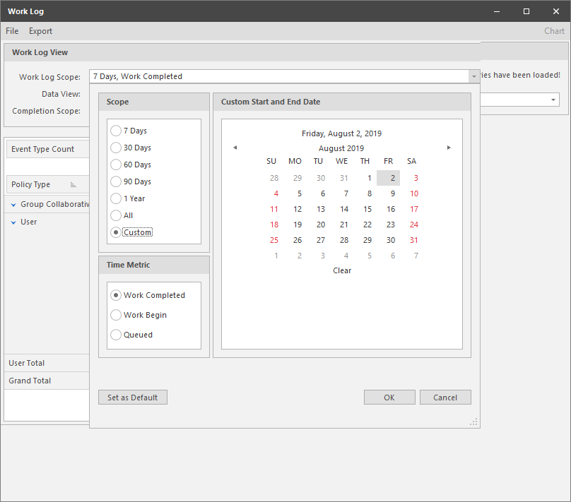Scope: Lets you specify the timespan for the report. All of the Days options will include events, according to the selected Time Metric option from today’s date. The All option will include all events, according to the selected Time Metric option. The Custom option lets you select a start and stop date from the calendar using the Shift key.