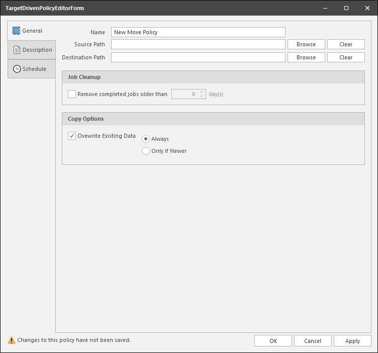 Select the Remove completed jobs older than check box and specify the number of days that a Move task from this policy is listed on the Jobs list before it is purged.