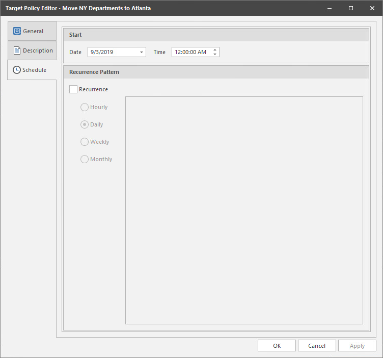 (Conditional) If you want the Move policy to run on a recurrent basis, select the Recurrence check box and then select one of the options.