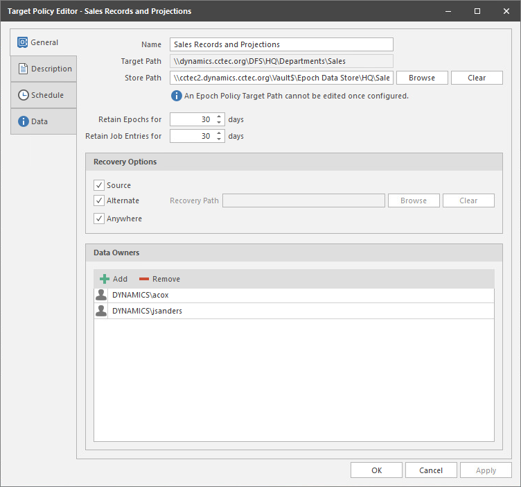Recovery Options: Specifications for where recovered files can be placed by the Data Owner on the network.